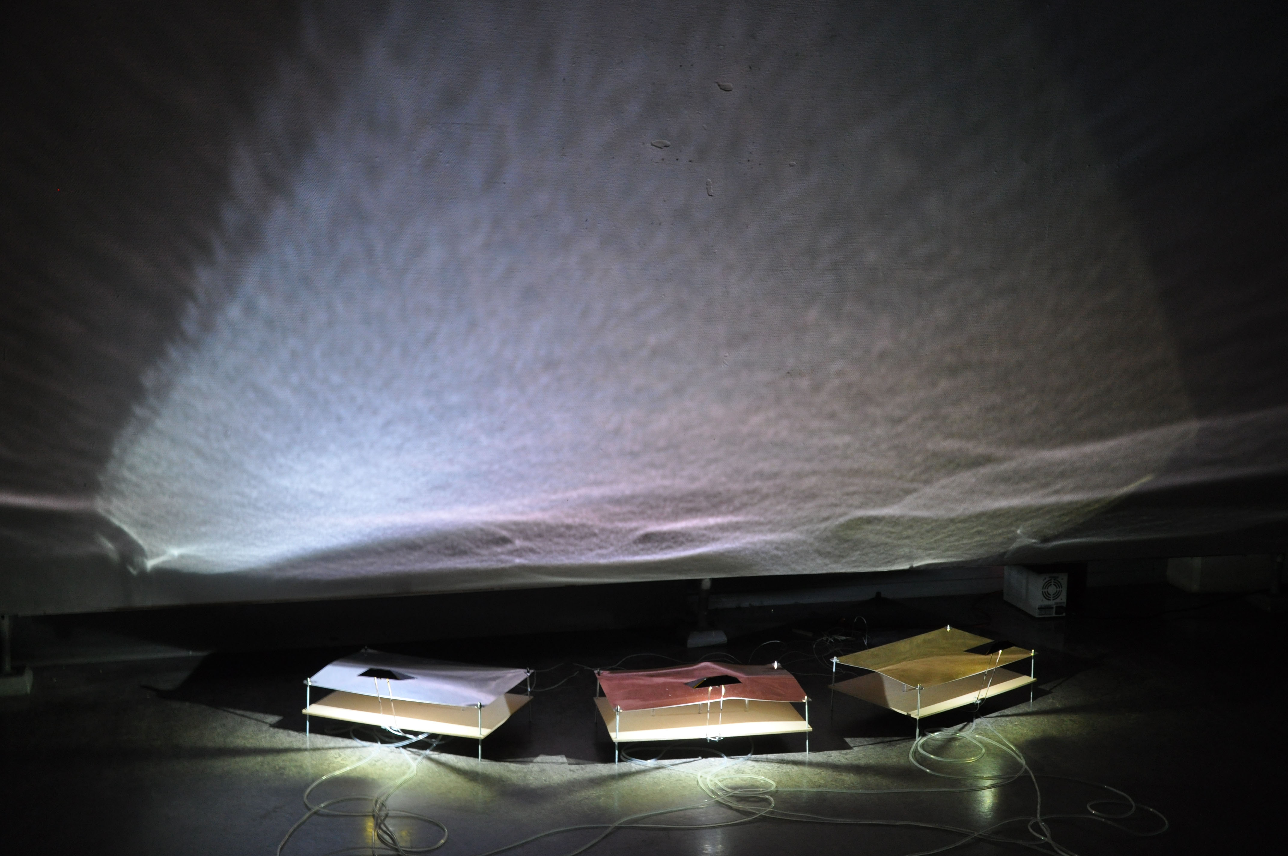 This is a interactive light installation. It consists of three reflecting sheets with attached high power leds. The sheets reflect light and create visuals on the wall. Underneath each sheet there are some pistons filled with water. These pistons are connected to a few meters of tube with a pressure pad. Visitors step on these pads forcing the sheet to move thus the visuals change.